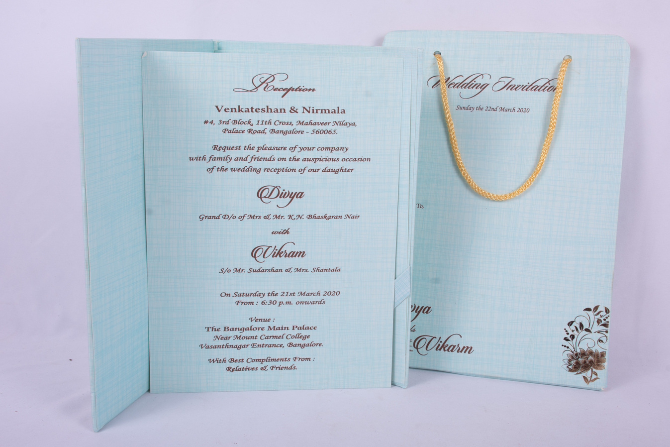 We provide attractive and superior quality Invitation cards for Wedding, House warming ceremony and many more occasions.